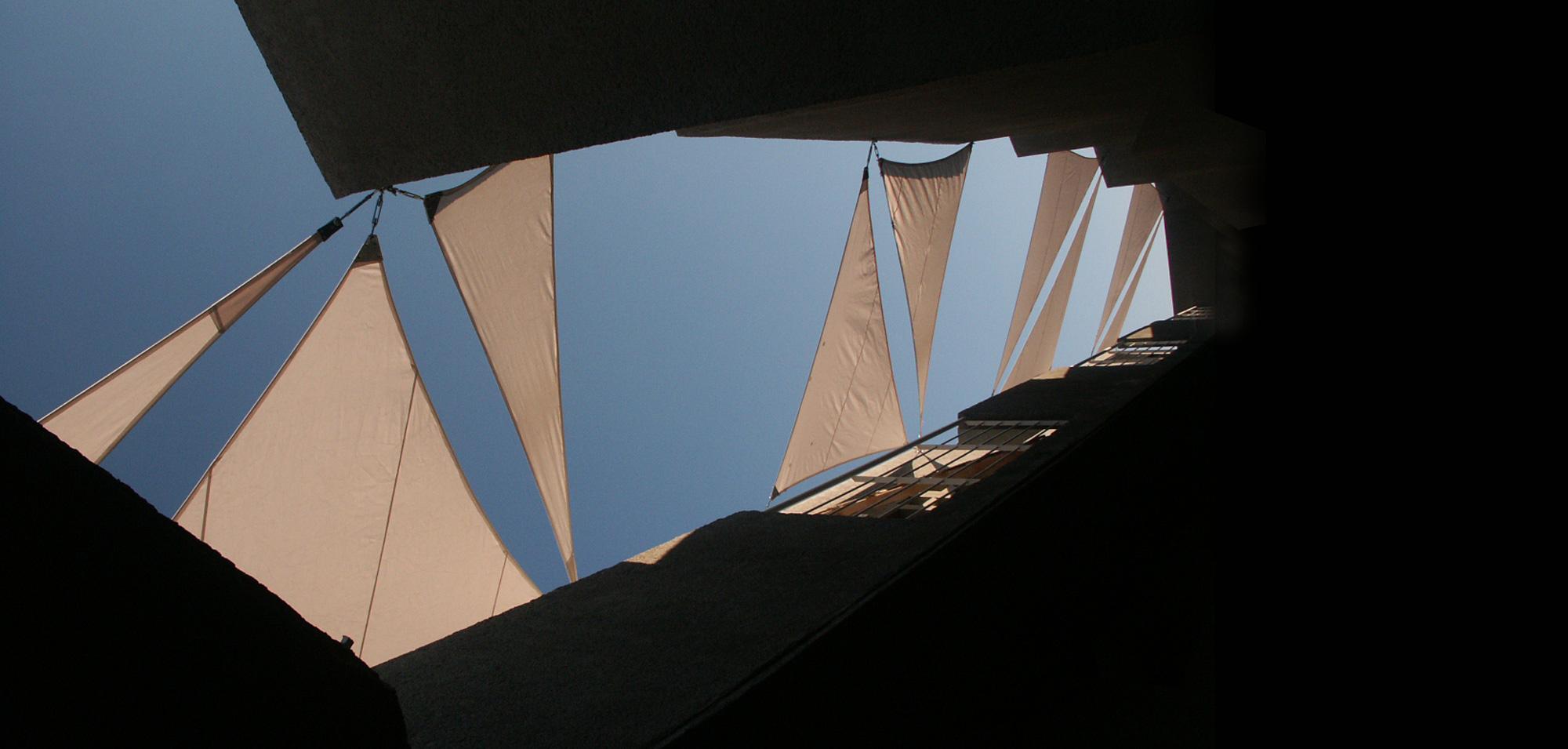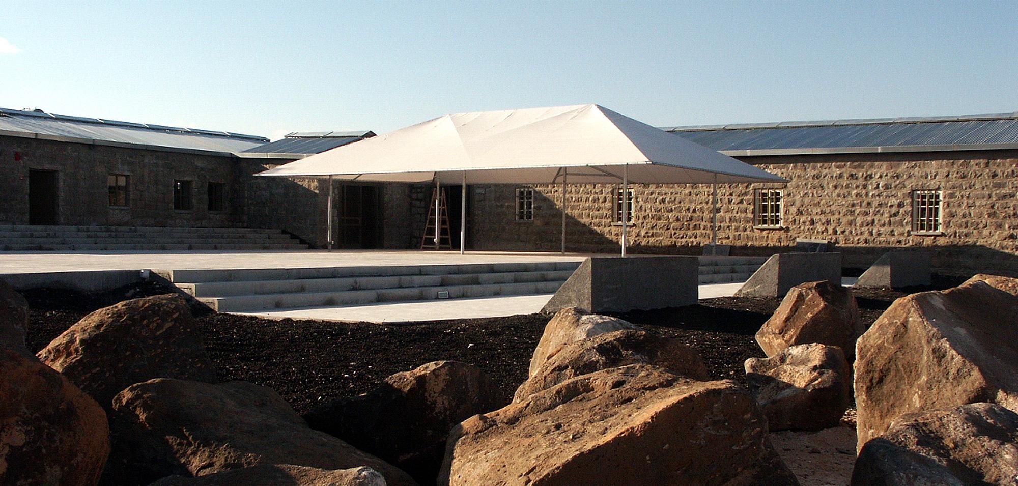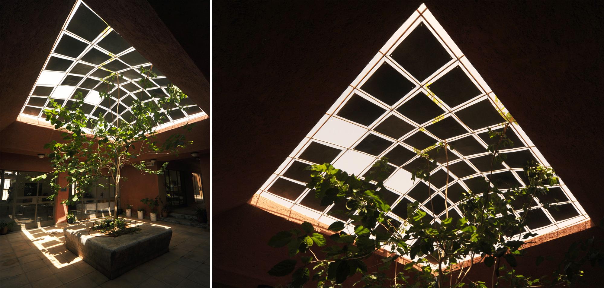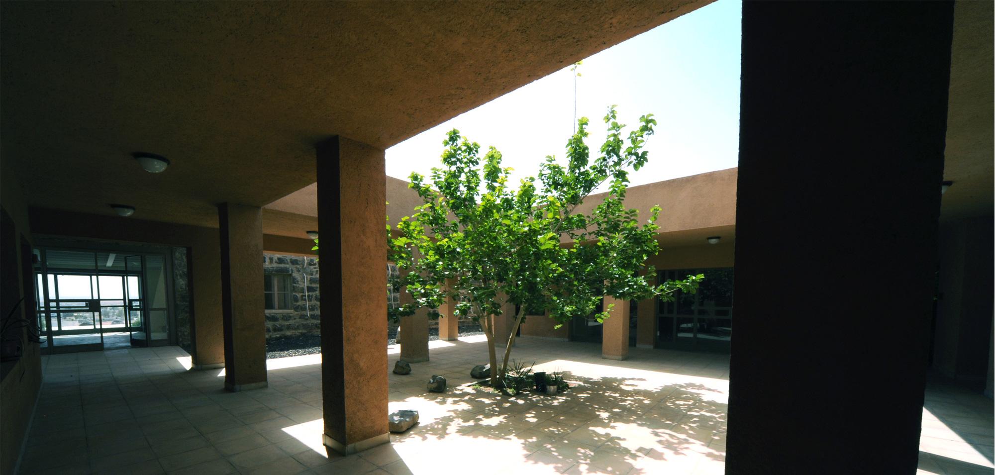 The third component of the lodge is some recently-added handicraft workshops. The design of the workshops' halls had to be introverted, opening up to courtyards within, since the other buildings blocked the view and the western elevation is at a close proximity to a military base. The major breathing space for the workshops is the tree courtyard which houses a galvanized-metal-sheets dome, creating a grid of light. It plays beautifully with the desert light that projects in, hitting objects, visitors and the tree. The screen dome resolved the glare that is usually associated with desert courtyards. It also stimulates the tree to grow faster, provoking it to extend its foliage to catch the light.