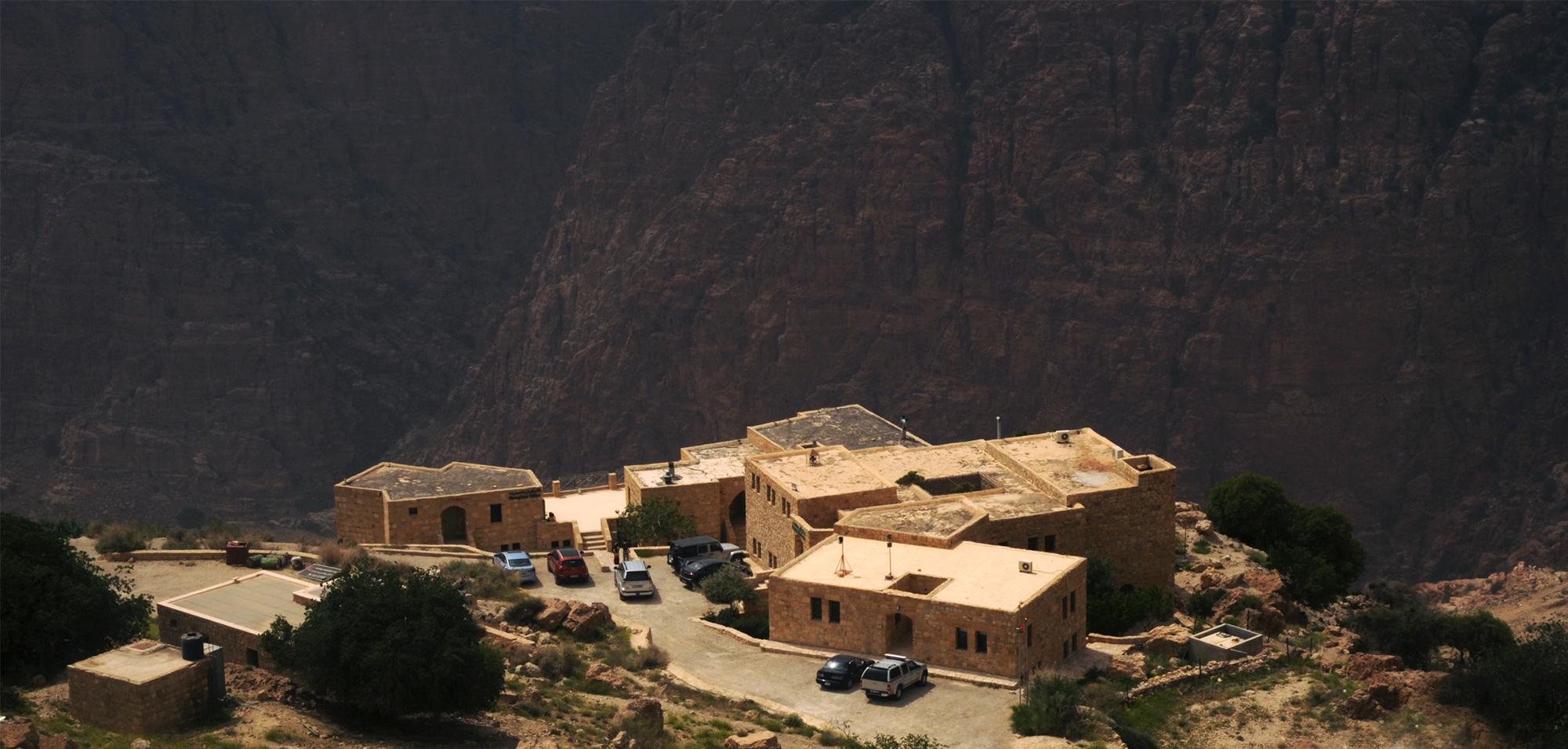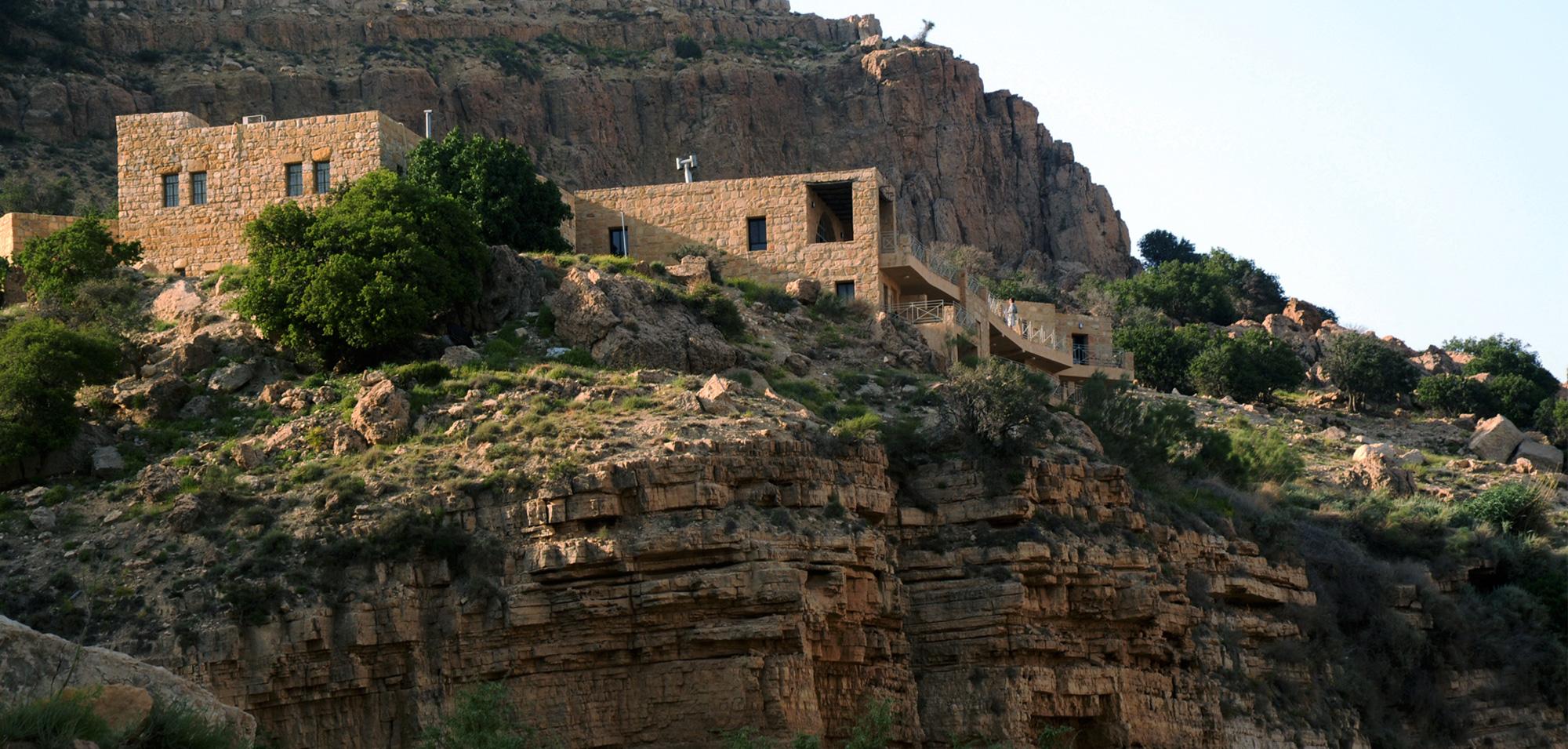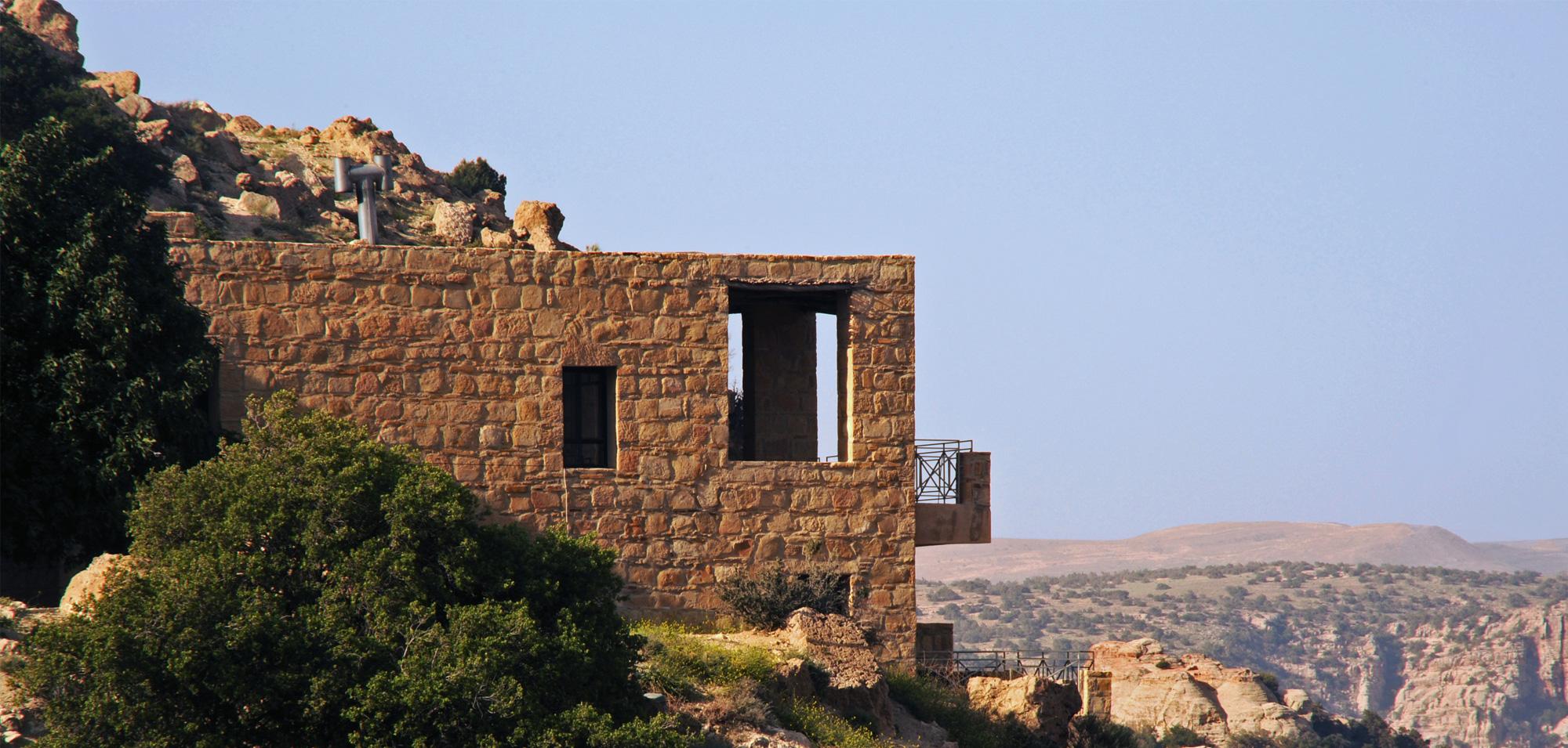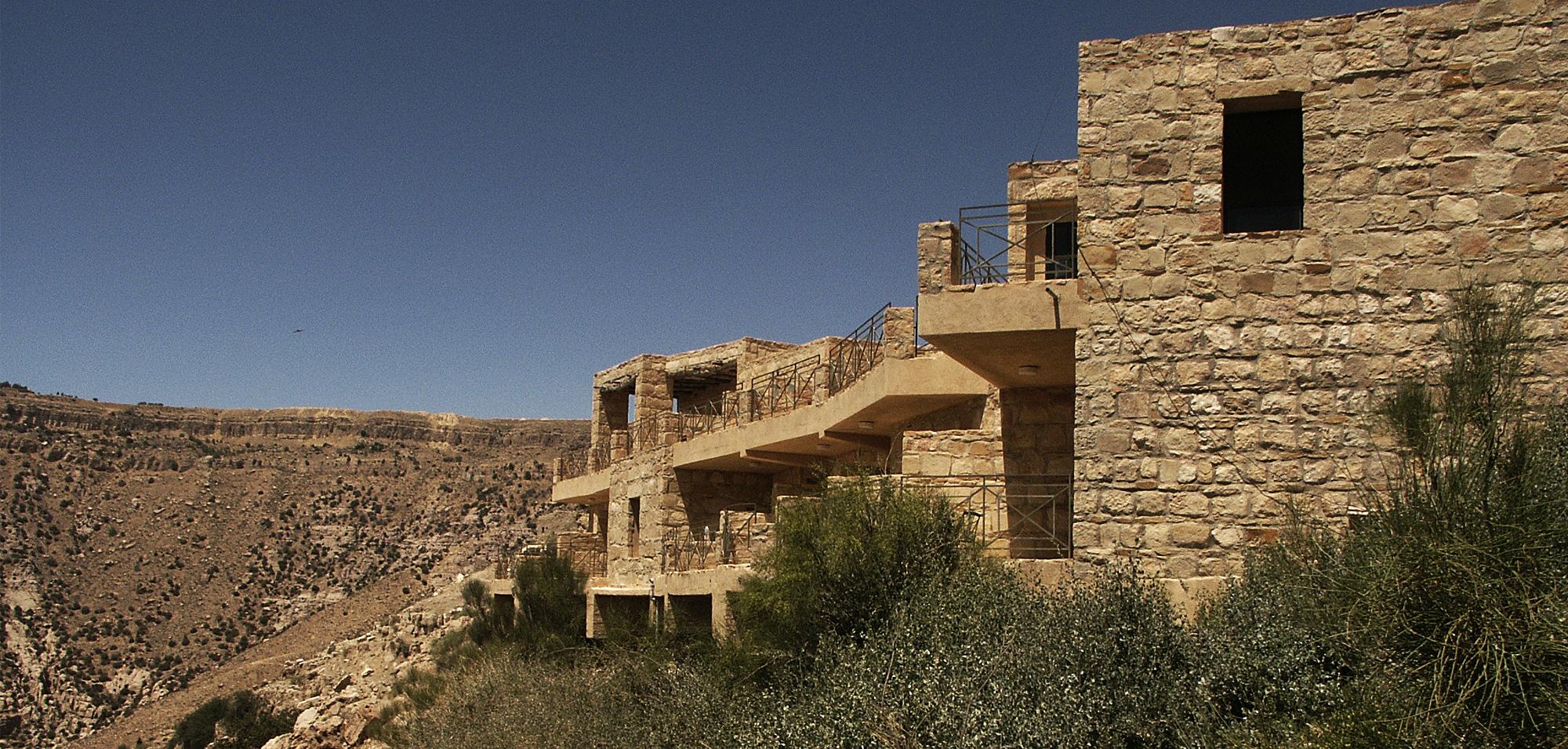 Set on a cliff in Dana Biosphere Reserve, Dana Guesthouse sits on a very unstable foundation with a very bad soil. Half of the building's structure is thus suspended and cantilevered above the weak soil, and the guesthouse ends up floating over the cliff line. The building’s morphology resembles half a pomegranate whose other half has fallen into the valley.