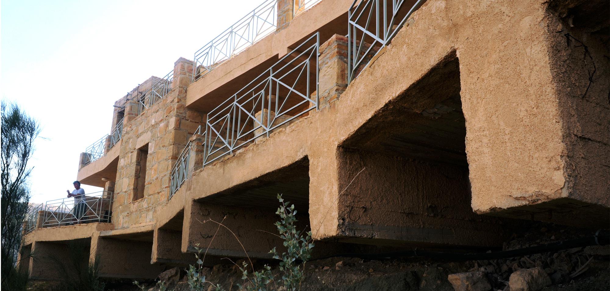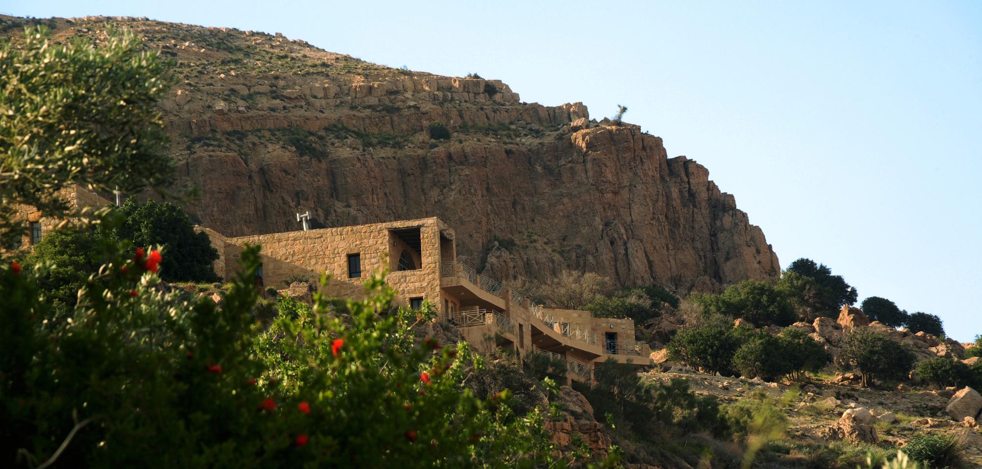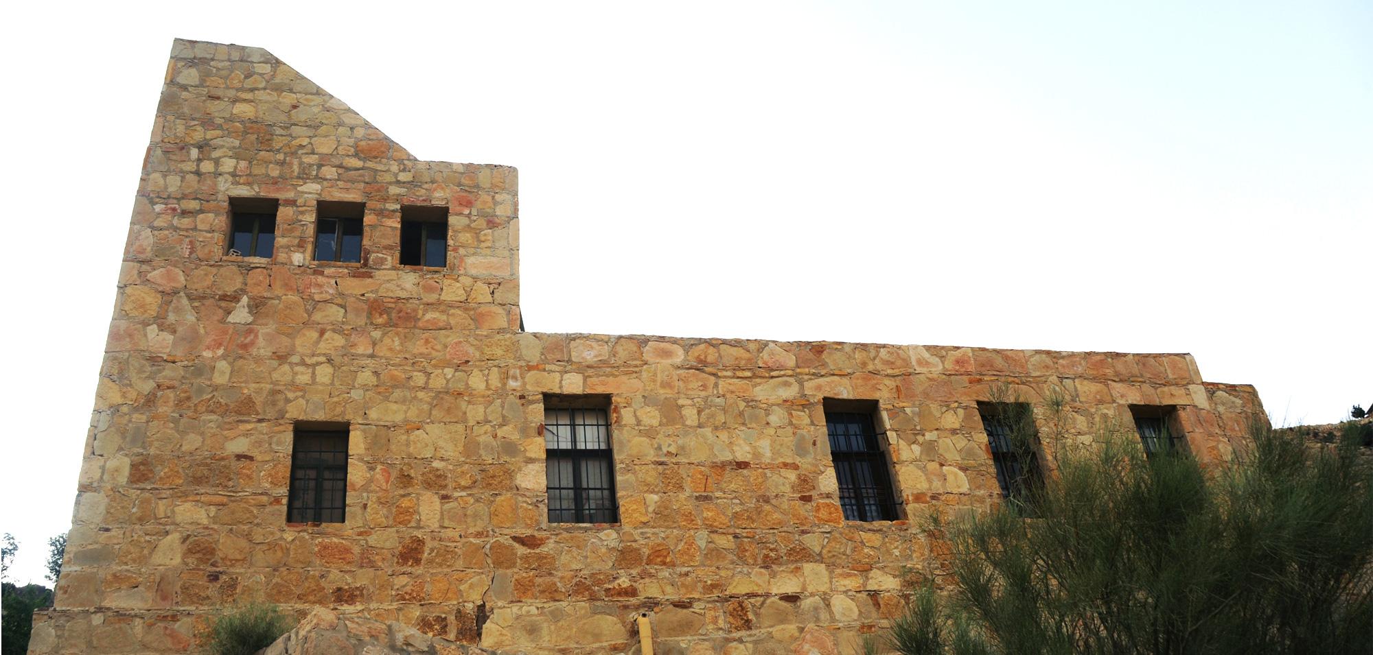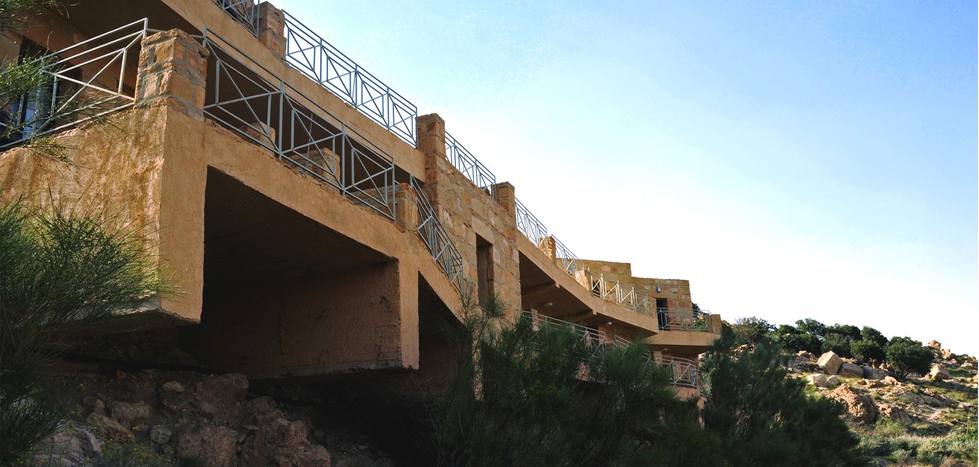Set on a cliff in Dana Biosphere Reserve, Dana Guesthouse sits on a very unstable foundation with a very bad soil. Half of the building's structure is thus suspended and cantilevered above the weak soil, and the guesthouse ends up floating over the cliff line. The building’s morphology resembles half a pomegranate whose other half has fallen into the valley.