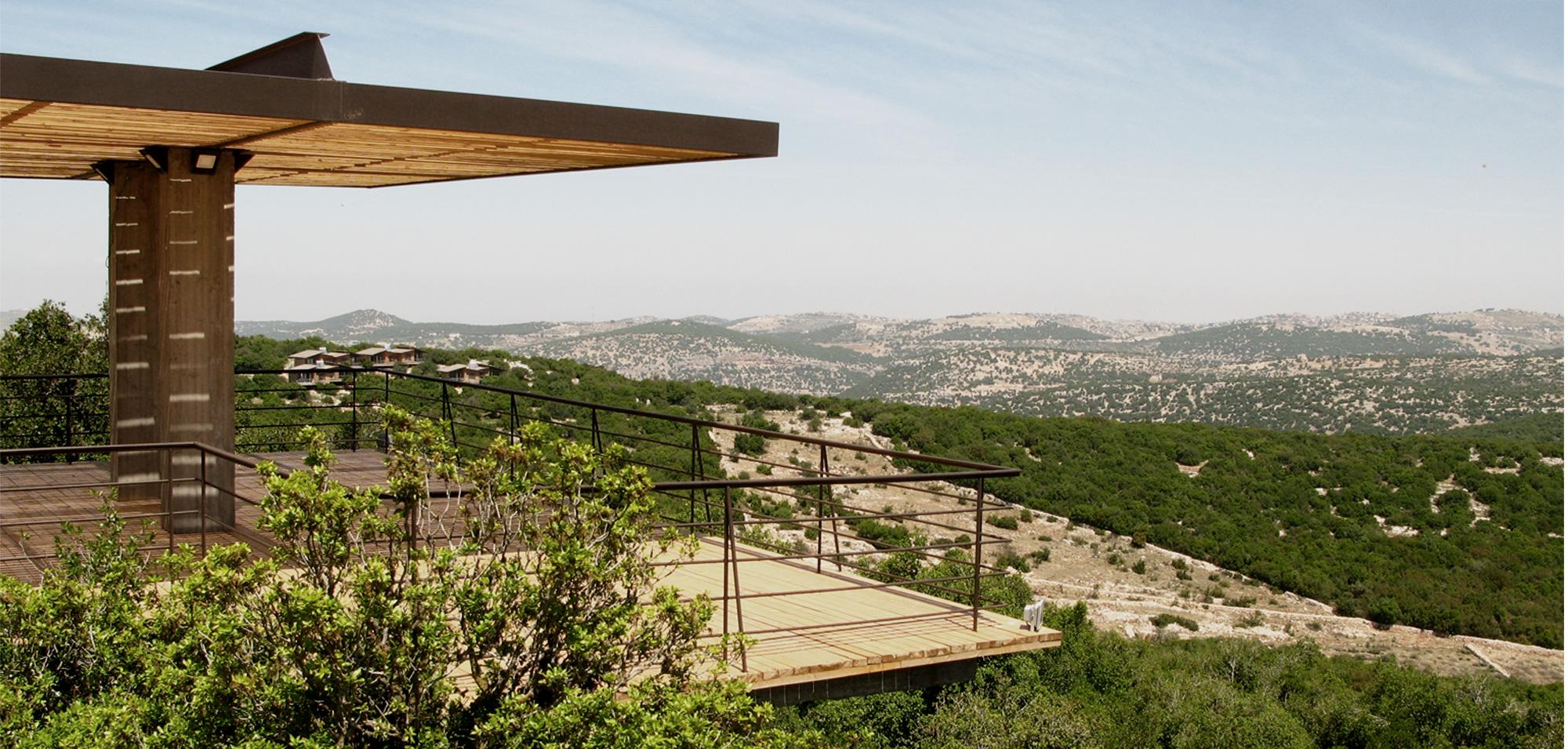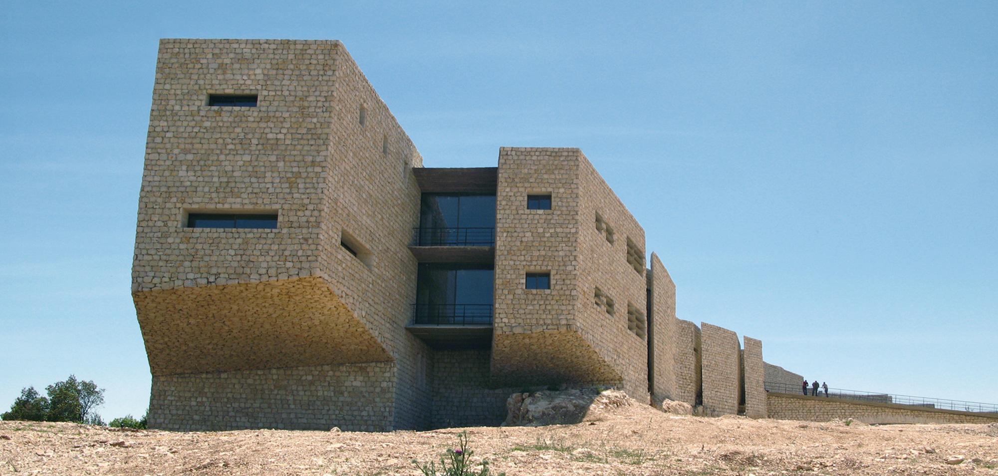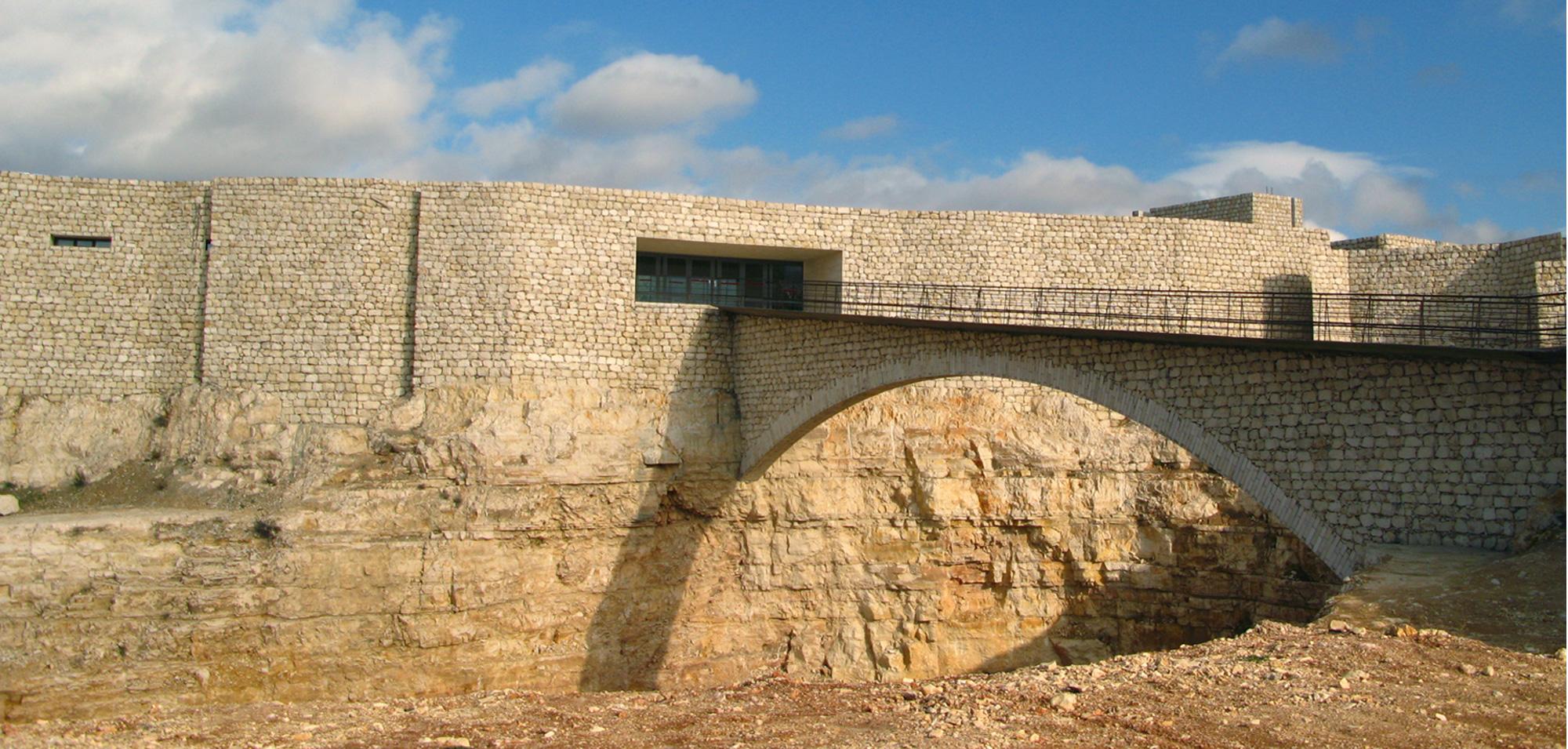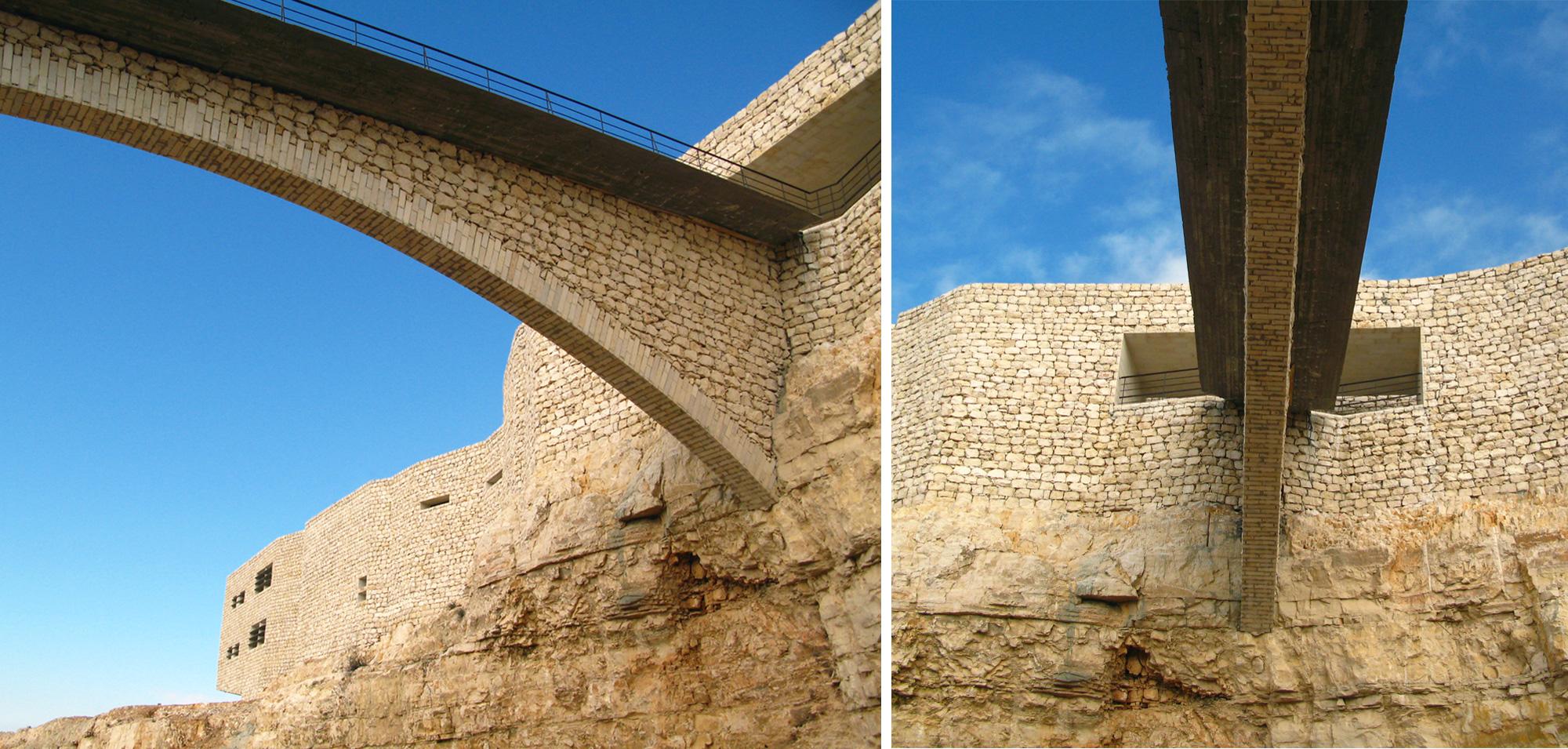 Arriving to the building after crossing a bridge spanning 30 meters over the quarry gap (the longest masonry arch in Jordan and probably the region and is equivalent in diameter to Hagia Sophia’s dome), the building welcomes you at the exact middle contact point between the restaurant's dining room to your right, and the academy to your left. There, the quarry rock acts as the main foundation.