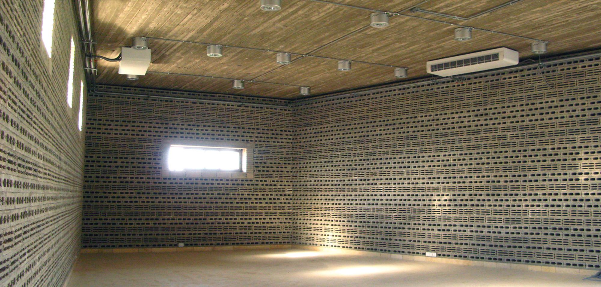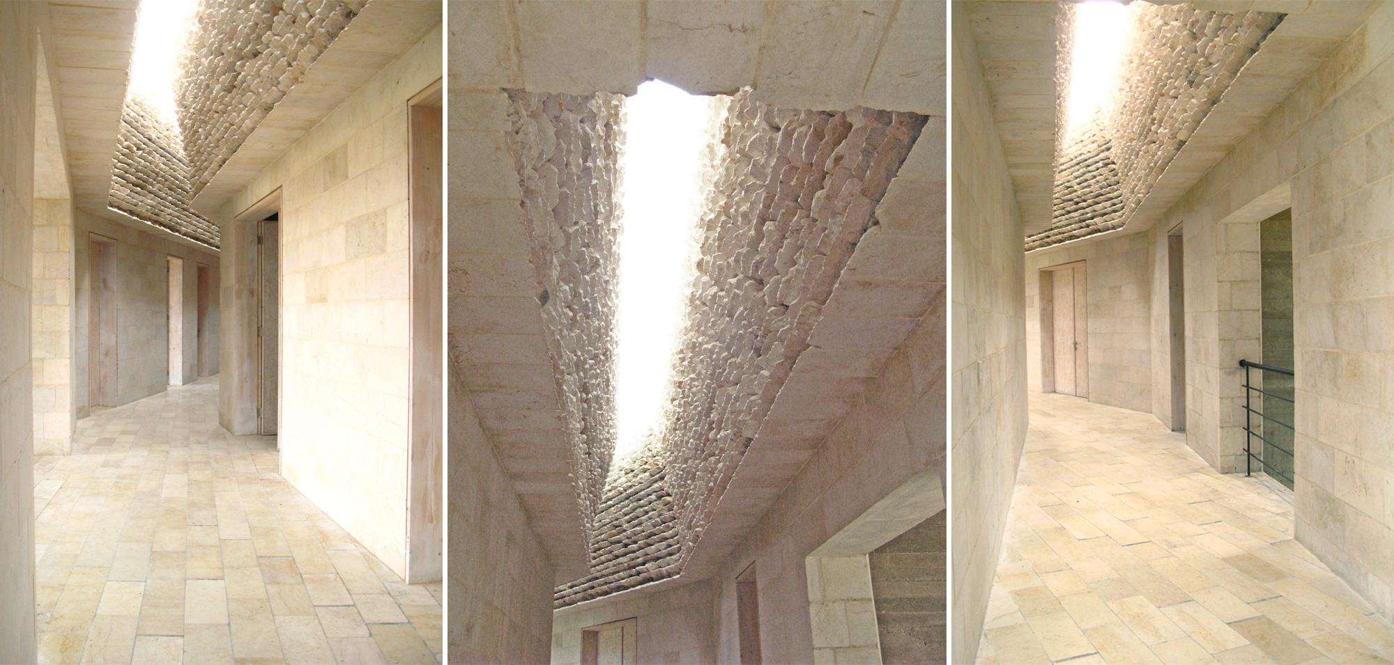 The corridors are defined by a crack in the ceiling that lets natural sunlight in and guides the visitor to the rest of the academy. The building has a very basic treatment of materials. It is made from Ajlouni lime stone from the site's quarry and other quarries that share the same strudel of rock. In the lecture hall, plain concrete block is used for acoustic buffering and insulation in addition to straw in the wall sections. Cuts in the walls were kept exposed without plastering, which shows in the openings of the hall.