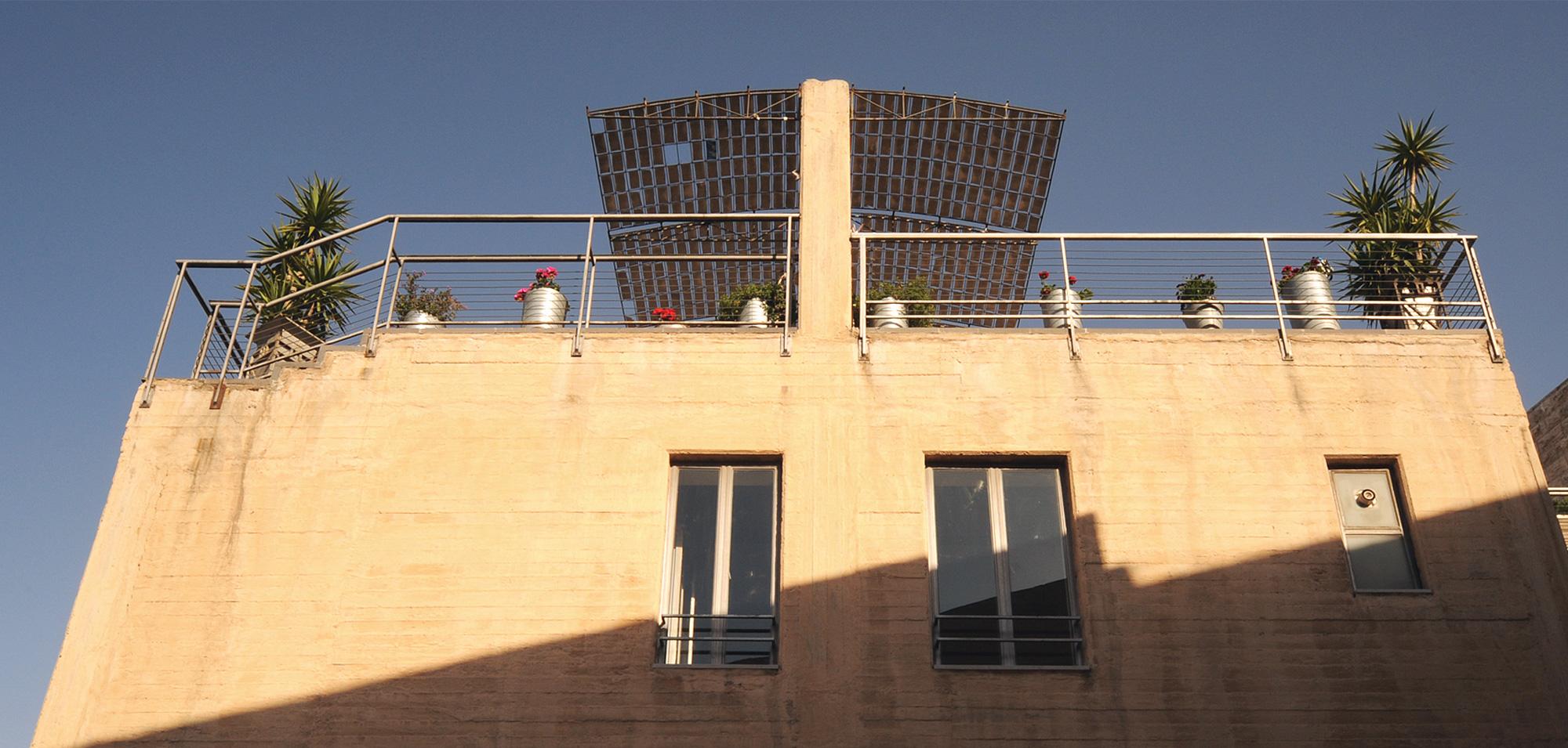 Conceived as a hanging mass from the upper street descending down for three more floors made the building fly in space like a table or a chair with naked concrete trusses for legs.