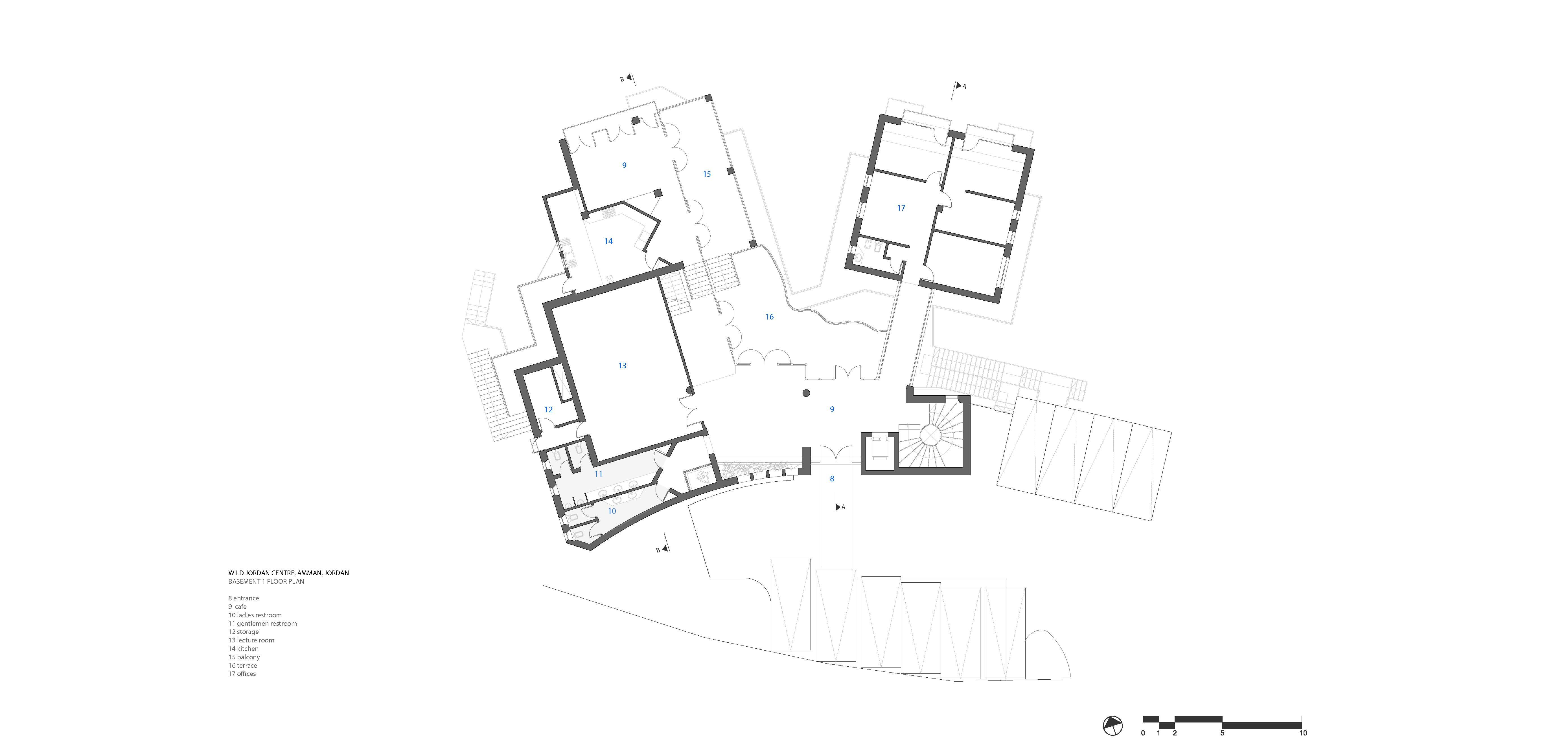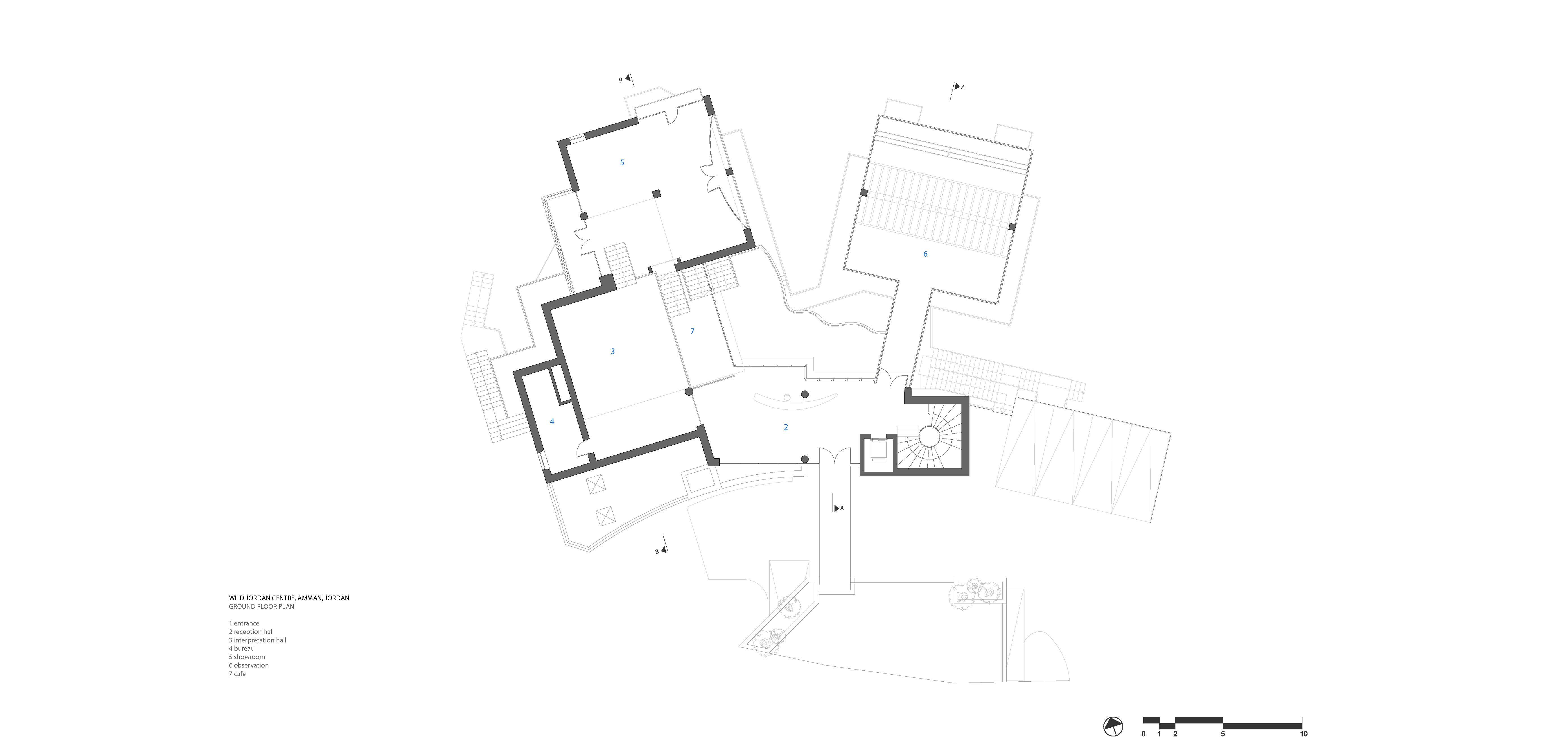 The Nature Center's program flows very fluidly in the space, with many multi-functional zones that can be used for anything. The space holds a craft shop, organic shop, café, lecture halls to support and promote eco-tourism, in addition to offices and exhibition spaces. The upper terrace, however, is the highlight of the Nature Centre. It serves as an urban marketing station where many tourism groups, and even architecture students, stop to witness the multi-layered city: from the Citadel, late Ottoman period and early starts of Amman to contemporary buildings and projects. The view from the terrace can explain the story of the city from only one spot which is a witness on the ever-changing face of the city.