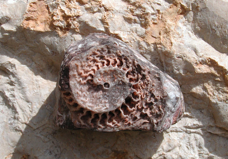 The Kings’ Highway on the wheat-land plateau south of Madaba reveals on its sides the uppermost layer of rock, the newest of a long stack of rocks. Beneath are layers upon layers of about a thousand meters of sedimentary rocks. From this kilometer of rocks that formed under water for the past 500 million years Wadi Wala brings you down to a cross-section in the upper rock layers of the last 144 million years. Driving down this wadi is like diving into the remote past. Each meter you descend brings you back 2000 centuries in time. You are driving in the past, in the pages of a giant book, each page or rock layer has kept in it the animals of its age; fossilized in stone. Like the way some preserve flowers between pages of a book, rock layers hold fossils of different kinds.