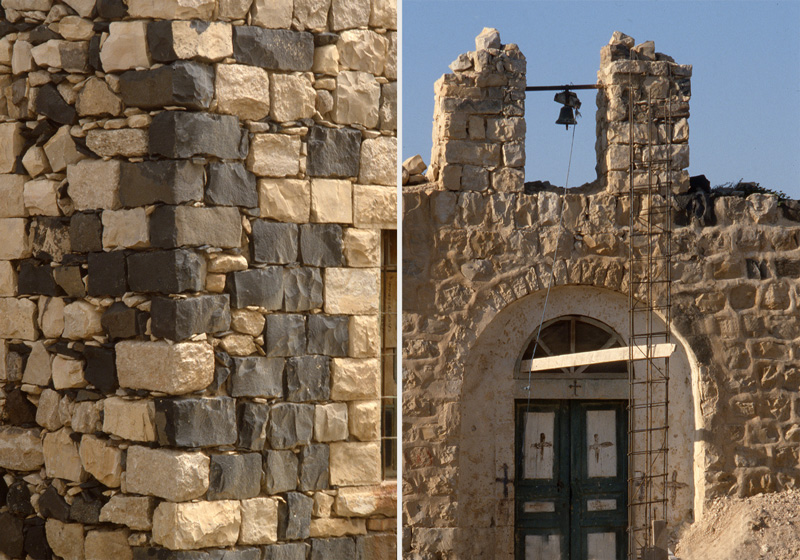 Many of the traditional houses of Hmoud were built on caves that used to be a strong attraction for settling this site, as they provided early shelters prior to the advent of construction. The village reads as a one-piece complex, made of cubes that are similar in size and orientation. Walls are randomly spotted with black basalt stone, and in few elevations rows of basalt are alternated with rows of white limestone. The mixture of the two kinds of stone appears like colors in Karak grain sacks woven of white wool and black goat hair. Traditionally all houses were of one floor, with roofs of mud resting on oleander branches or tree trunks that span between stone arches. Only one traditional house built in 1921 had two floors.