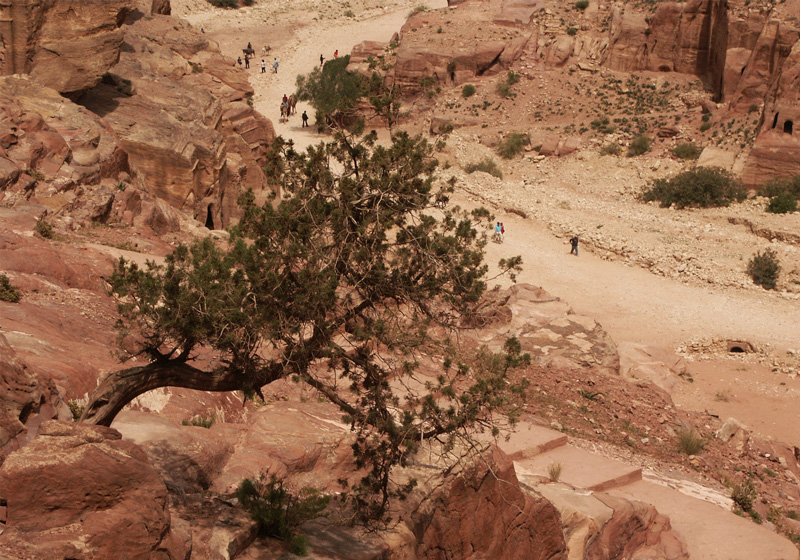 Hanging from vertical red cliffs, are the silver-blue caper bushes (Capparis cartilaginea); the blueness of their leaves is so intense, against the redness of Petra, that you start questioning the color calibration of your eyes. Standing like sculptures are juniper trees with their twisted trunks, in shiny lead, adding to the crisp air a scent of juniper oil as a hint of cleanliness.